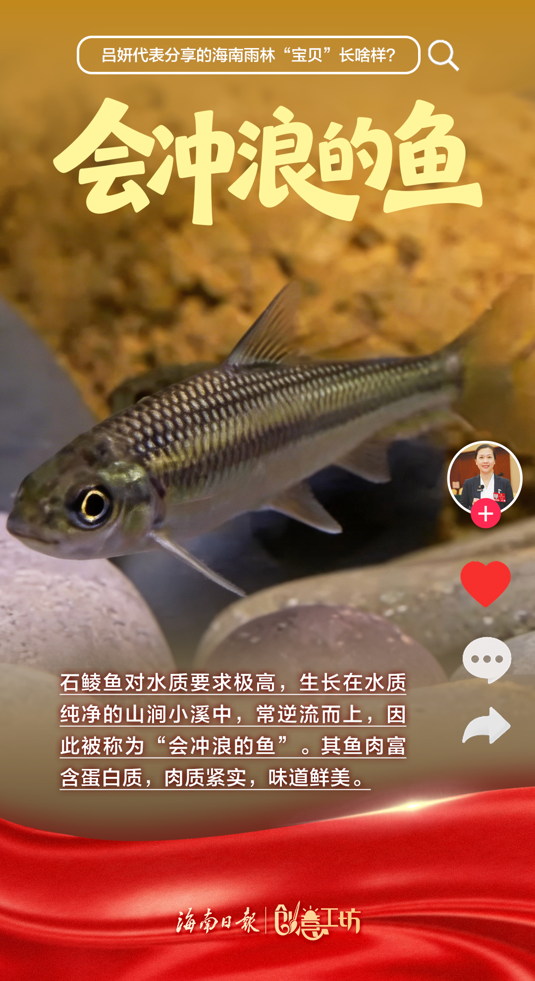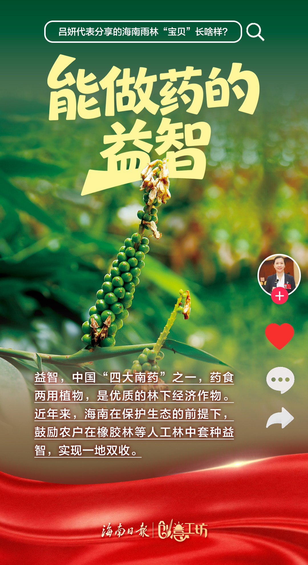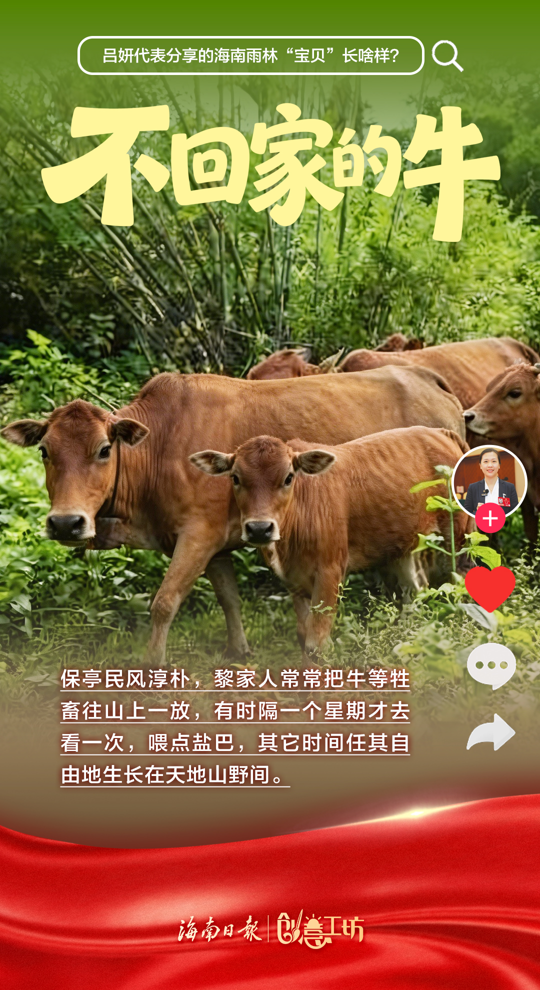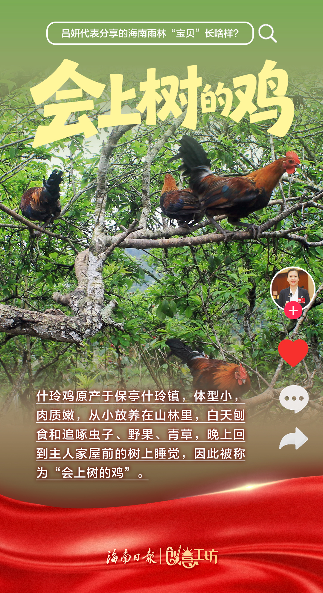 3月12日,十四届全国人大四次会议第三场“代表通道”在北京人民大会堂举行。全国人大代表,海南省保亭黎族苗族自治县委常委、副县长吕妍走上“代表通道”,向全国人民分享了海南雨林“宝贝”——能煲汤的五指毛桃、能做药的益智、会上树的鸡、不回家的牛、会冲浪的鱼、五只脚的猪。